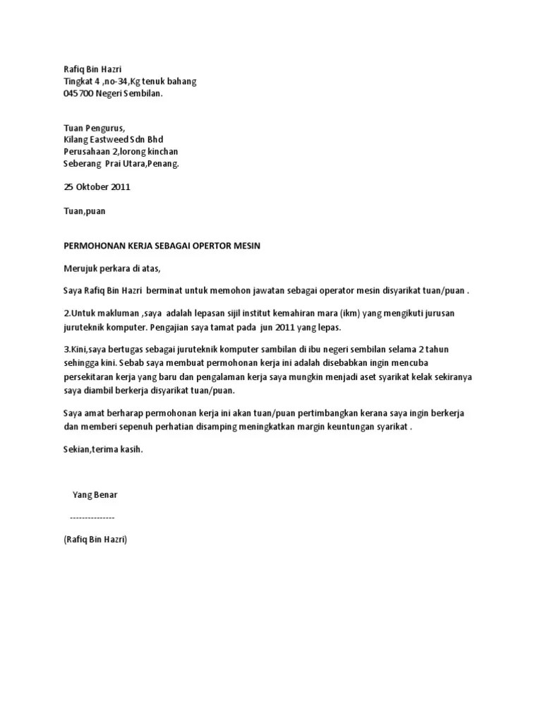 Agak leceh sikit bila hantar permohonan kerja dengan pos sebab ambil masa lama . Contoh surat permohonan jawatan pekerja sambilan harian. Seperti nama dan alamat pengirim, nama, jawatan, dan alamat penerima juga mestilah ditulis dalam huruf besar ada pemulaanya. Semoga panduan surat mohon kerja kosong ini dapat memudahkan anda mencari jawatan kosong. Surat rasmi permohonan kenaikan pangkat rasmi q. Dengan segala hormatnya saya merujuk kepada iklan (tulis nombor rujukan iklan jawatan kosong .